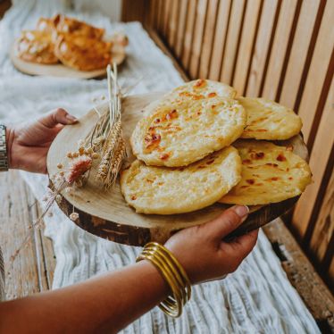 Pâte légèrement briochée et salée garnie de fromage frais corse de brebis cuit sur une feuille de châtaignier au four.